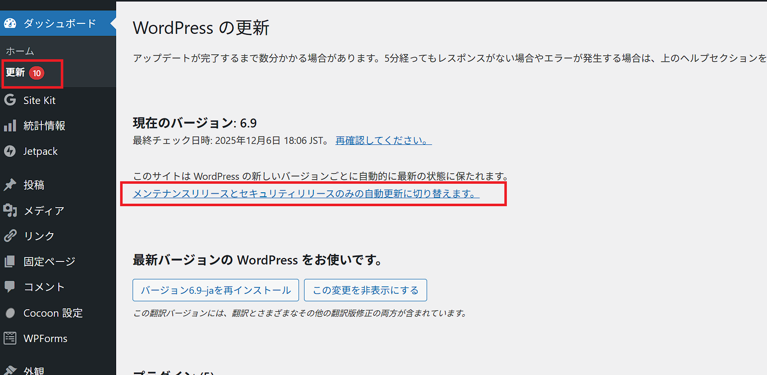 Wordpressのバージョンはアップデートしないで、セキュリティファイルのみ更新してくれるように設定を変更しました。