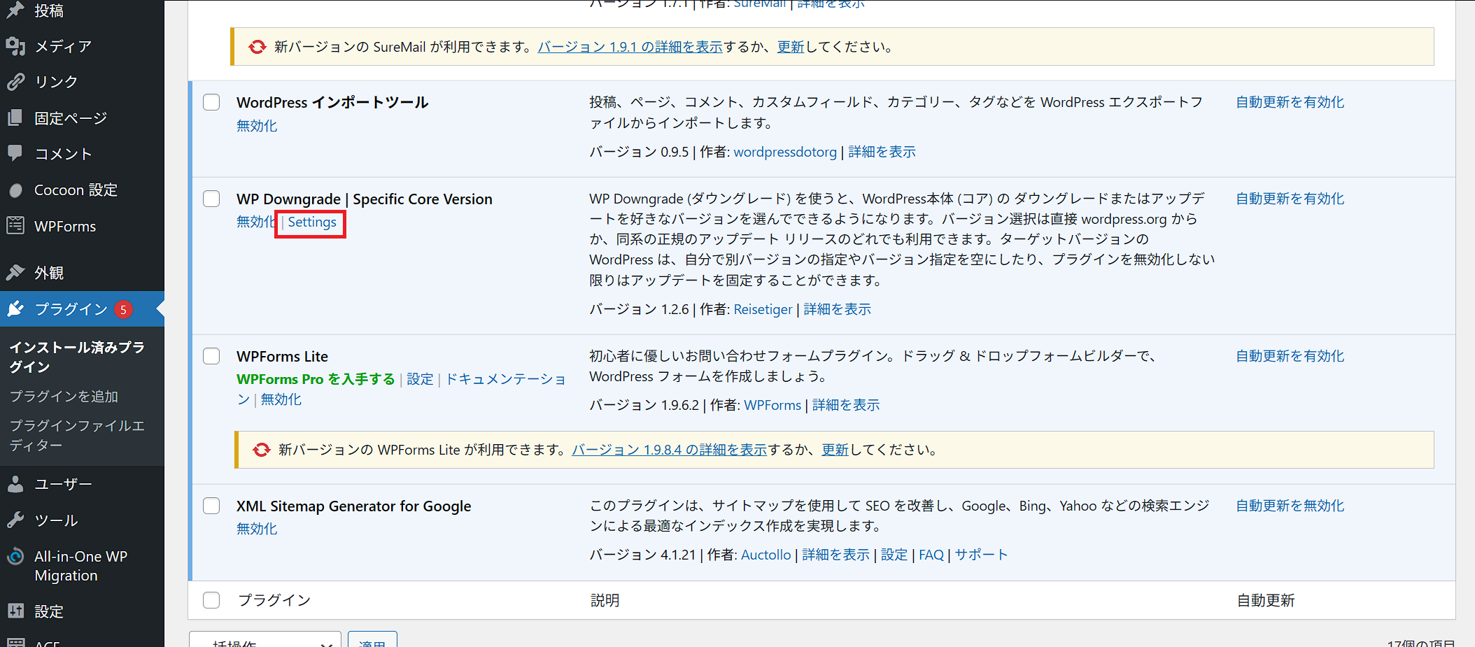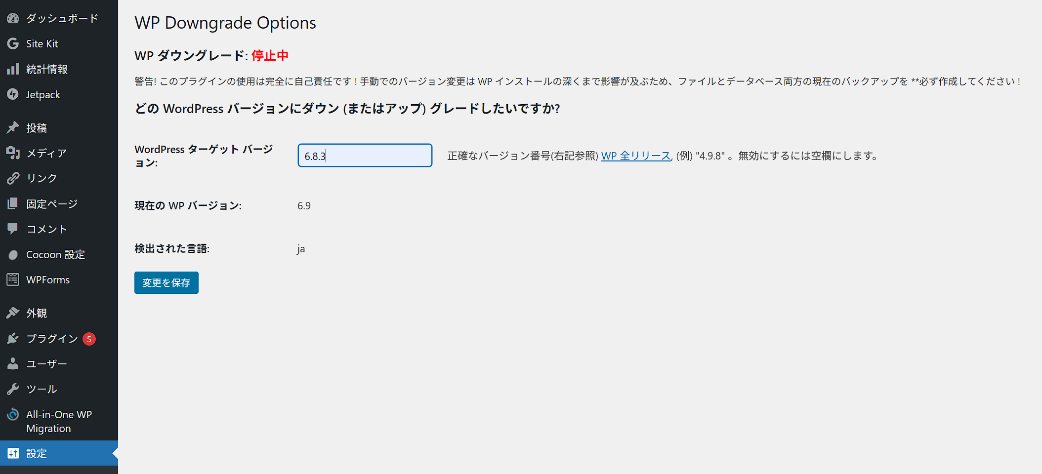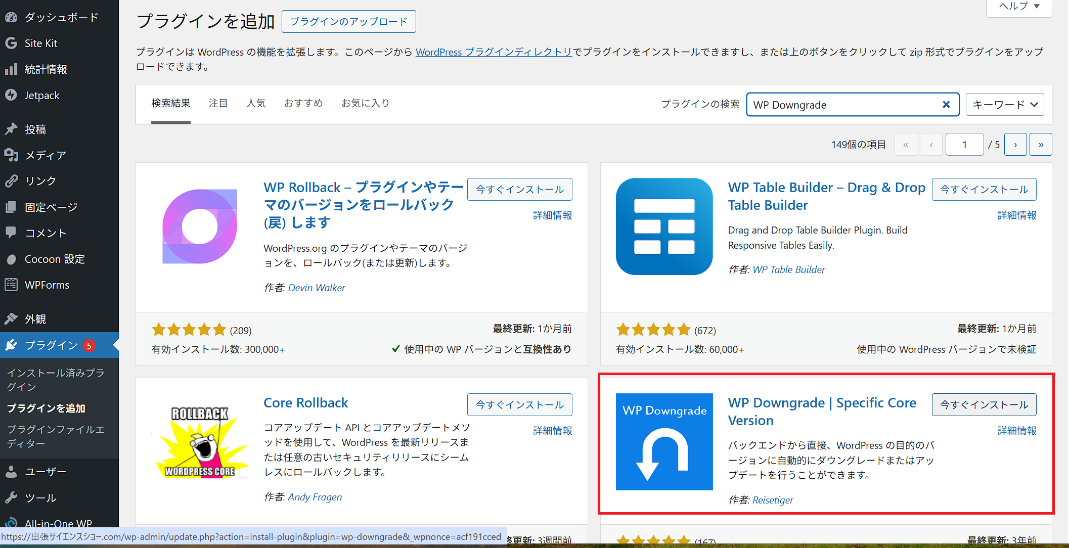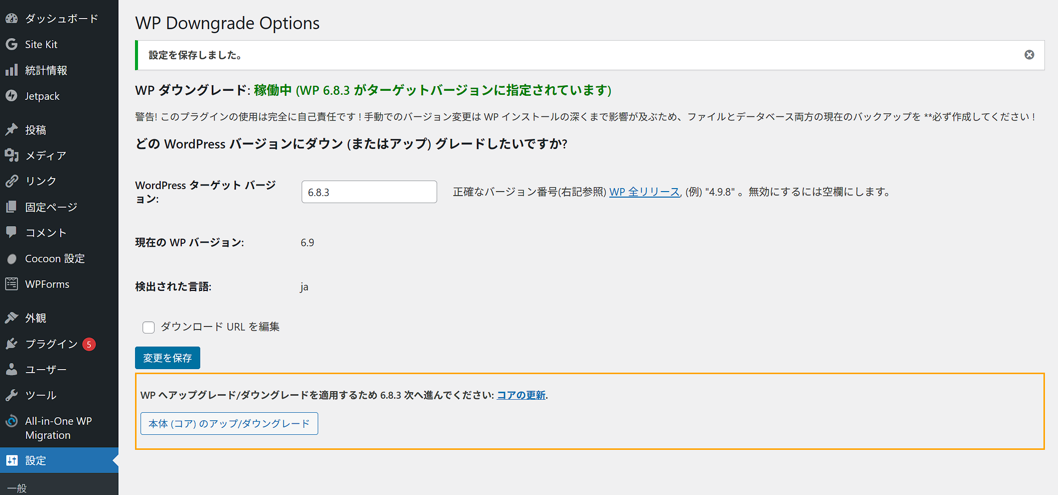 WordPressのダウンクレードができるプラグイン WP Downgrade を追加して有効化する