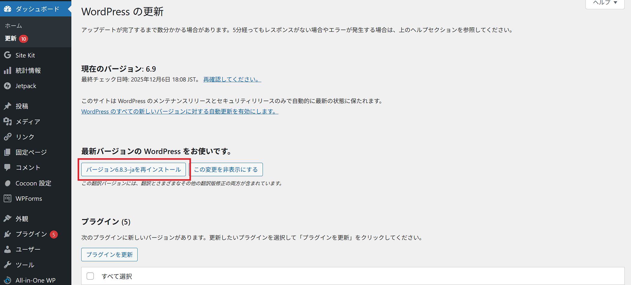 「バージョン6.8.3-jaを再インストール」を押下します。