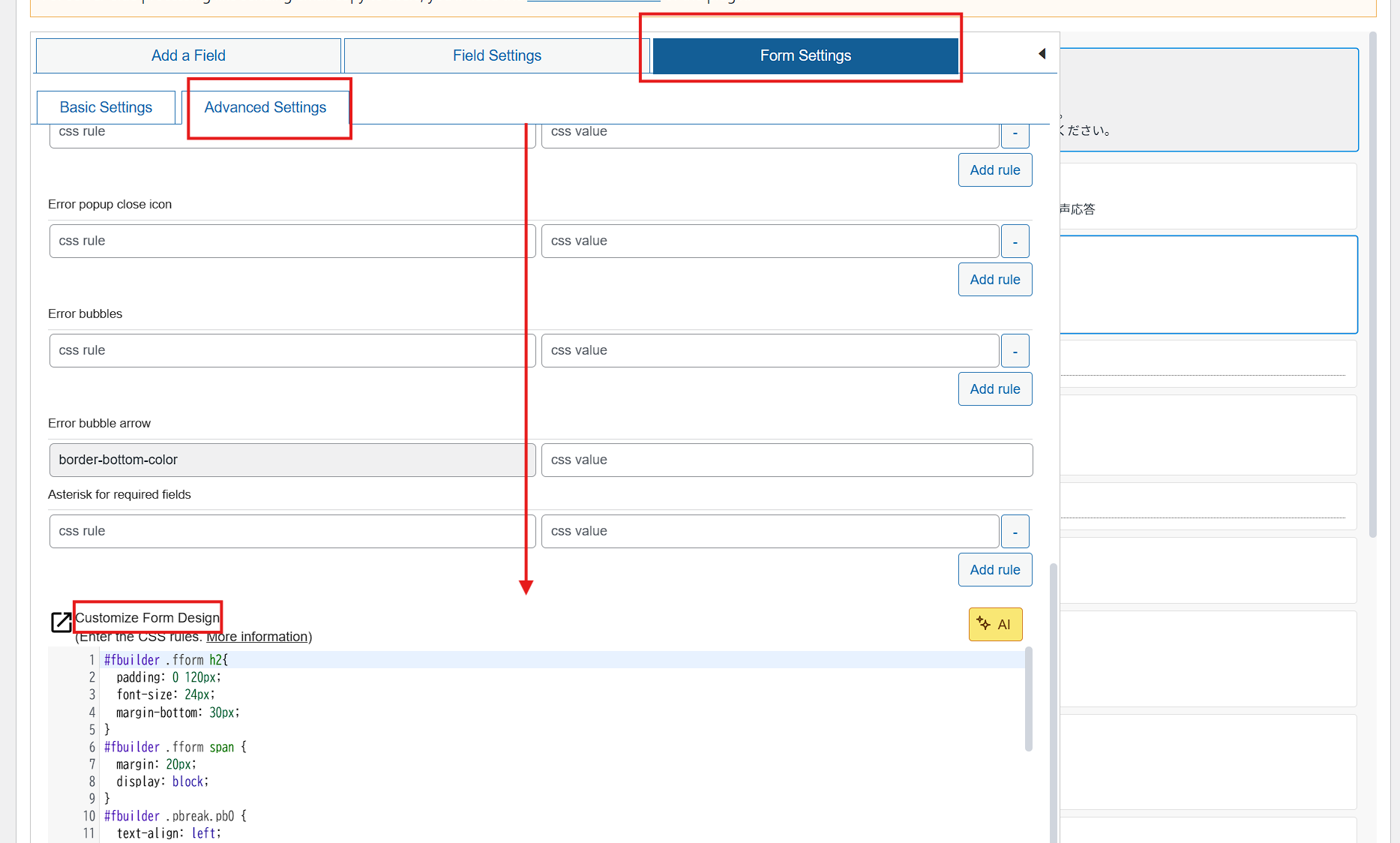 「Form Setting」>「Advanced Settings」の下の方「Customize Form Design」